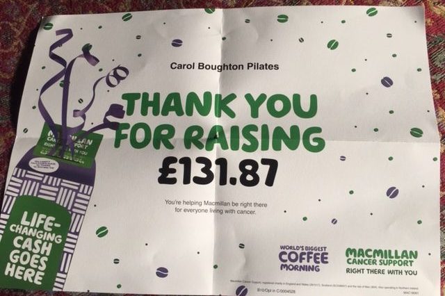In October I supported the Macmillan Coffee morning event and combined this with a free Pilates class.  I held two classes at the Holbrook Club, who kindly allowed me to use their studio for these events free of charge. – One was for my regular clients and another for those who attended the October Sussex…